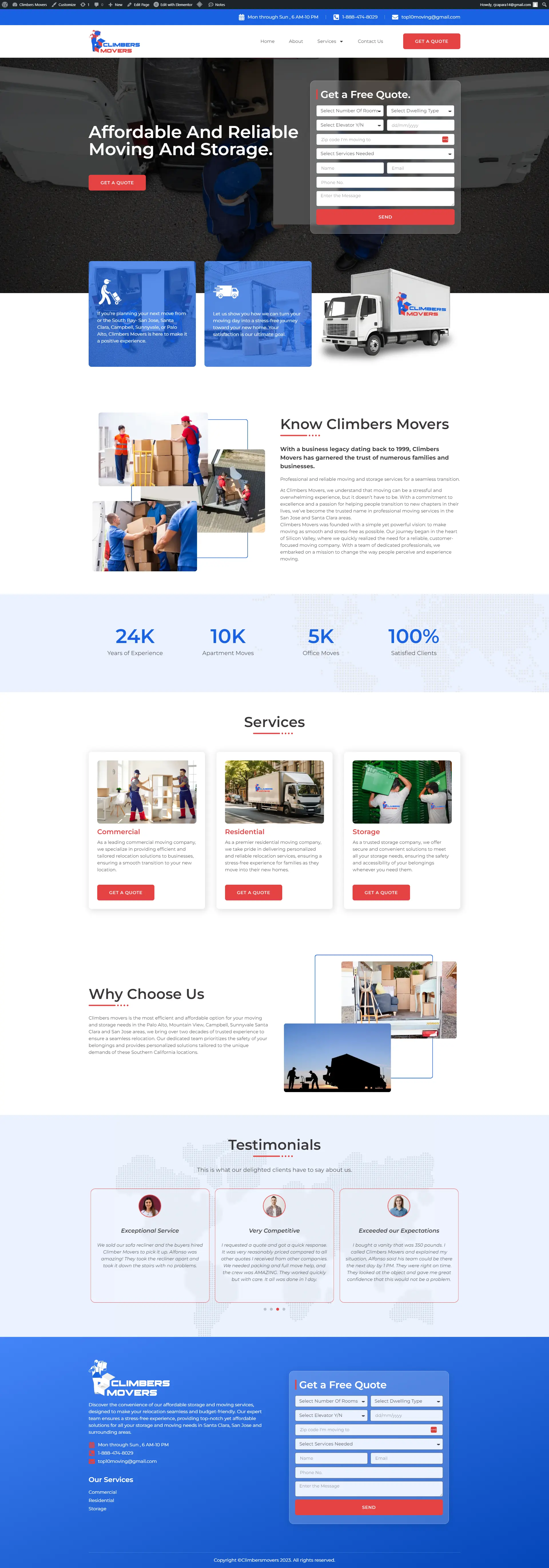 This project involved designing a professional website for Climbers Movers to showcase their residential, commercial, and storage services while encouraging potential customers to request moving quotes online. The website was structured with clear service sections, strong call-to-action placement, and an integrated quote request form to simplify the inquiry process for visitors planning their move. A mobile-responsive layout ensures the site remains easy to navigate for users searching for moving services on any device. The result is a modern service-based website that builds trust and supports lead generation for relocation services.
