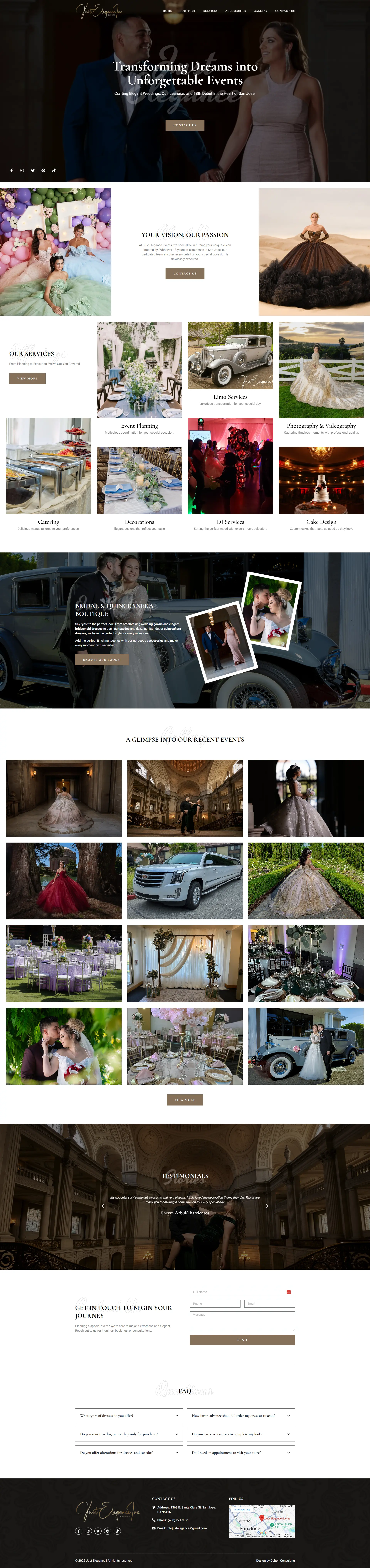 This project involved designing a professional website for Just Elegance Events to showcase their event planning services and highlight their experience in organizing weddings and special celebrations. The website was structured with visually engaging sections, service overviews, and gallery elements that help visitors explore past events and understand the planning services offered. Clear calls-to-action guide potential clients toward contacting the team to discuss their upcoming event. The result is a polished event planning website that builds trust and encourages inquiries from individuals planning memorable celebrations.