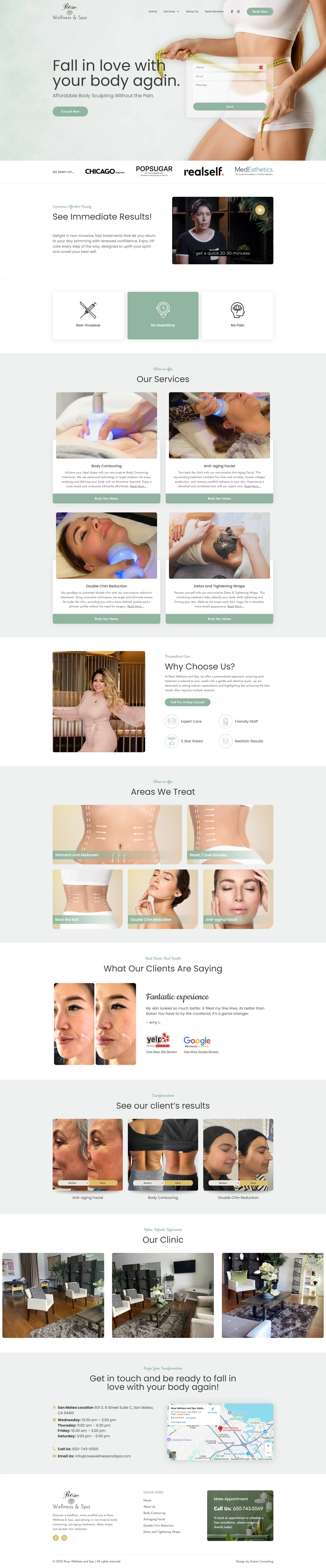 This project involved designing a professional website for Rose Wellness and Spa to showcase their spa treatments, wellness services, and relaxing client experience. The website was structured with clear service sections, calming visual design, and easy navigation that helps visitors explore available treatments and learn more about the spa. Strategically placed calls-to-action guide potential clients toward booking appointments or contacting the spa for inquiries. The result is a clean and inviting website that supports client trust while encouraging new bookings.