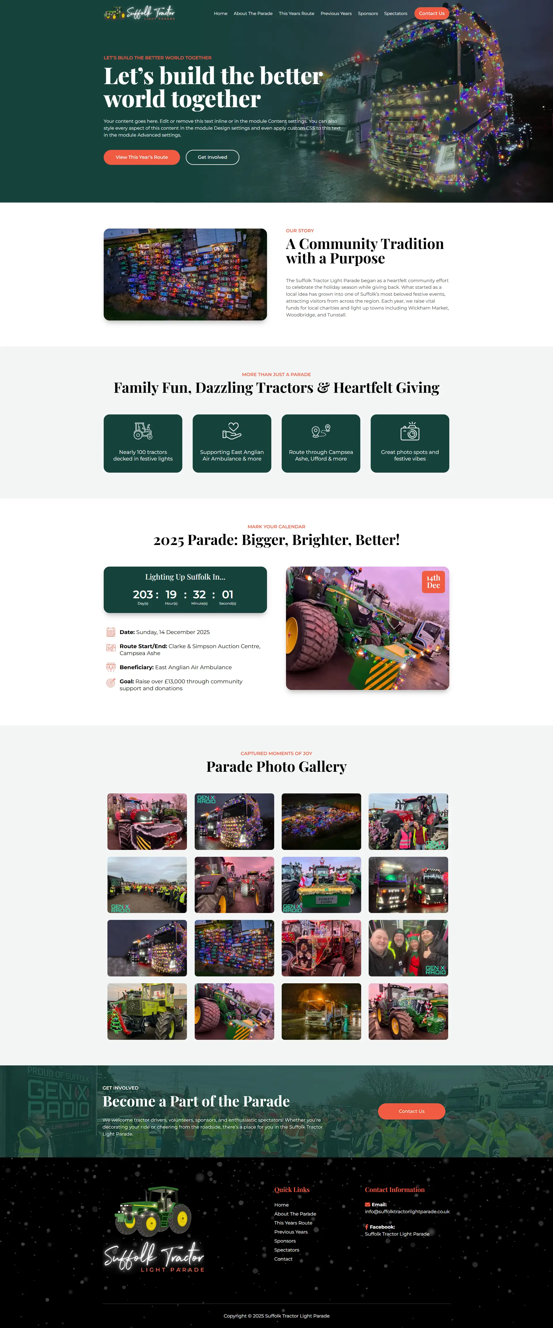 This project involved developing a dedicated website for the Suffolk Tractor Light Parade, a community charity event that brings together decorated tractors to support local causes. The website was designed to clearly present event information, schedules, participation details, and ways for visitors to get involved. A structured layout and simple navigation allow attendees, sponsors, and participants to quickly find relevant information about the event. The result is an engaging event platform that supports community awareness while helping organizers communicate important event updates and participation opportunities.